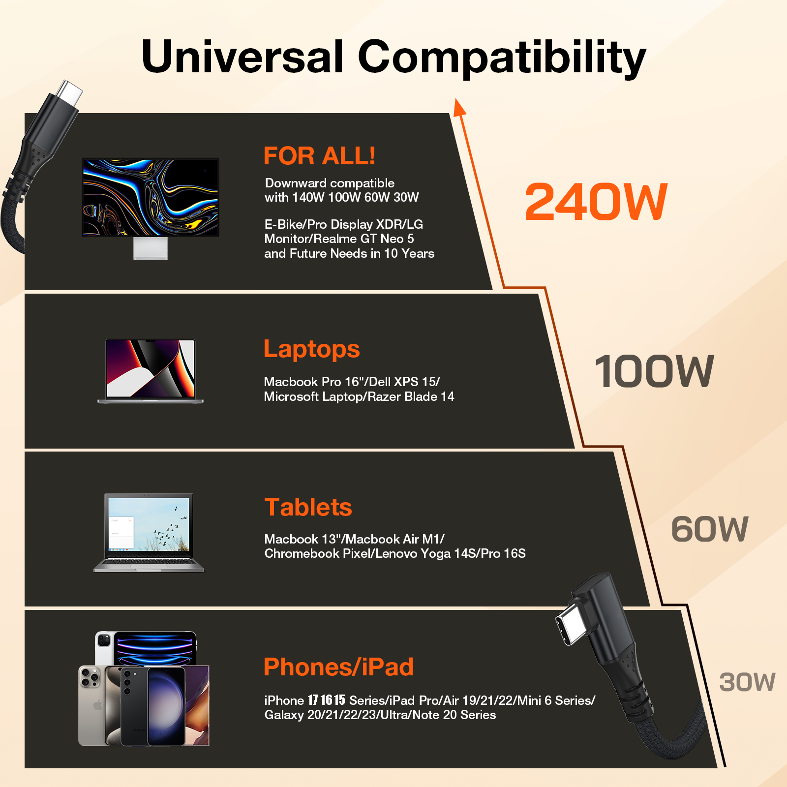 - 240W Fast Charging: The USB C fast charging cable supports fast charge up to 240W(48V 5A) when paired up with a compatible cable and charger. Backward compatible with 200/170/140/100/60/18W power devices.(Note: Charging speed may be dependent on the host device’s charging capability).